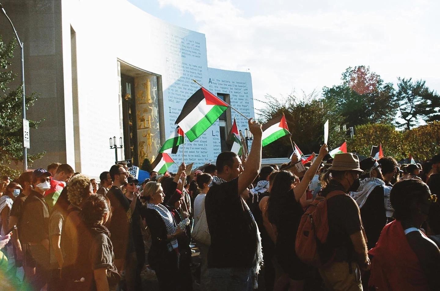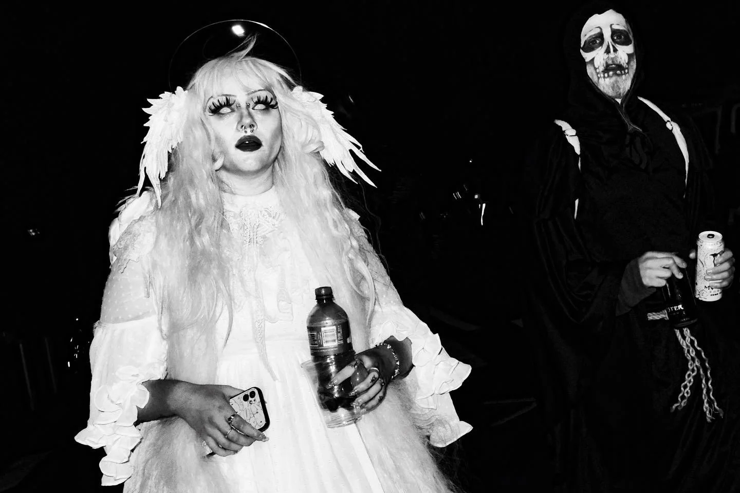 A young boy holds back tears before placing a flower outside Le Carillon bar.