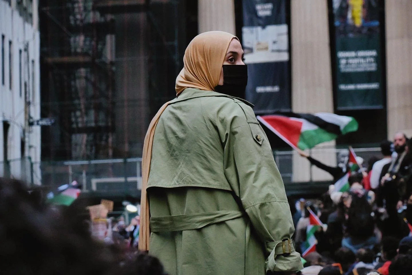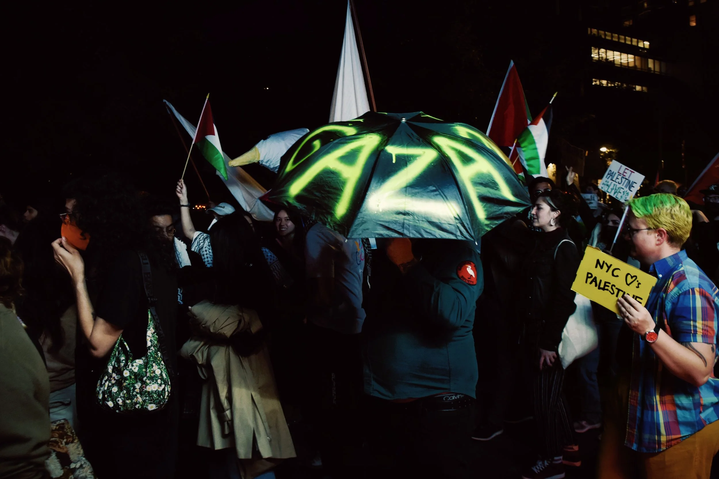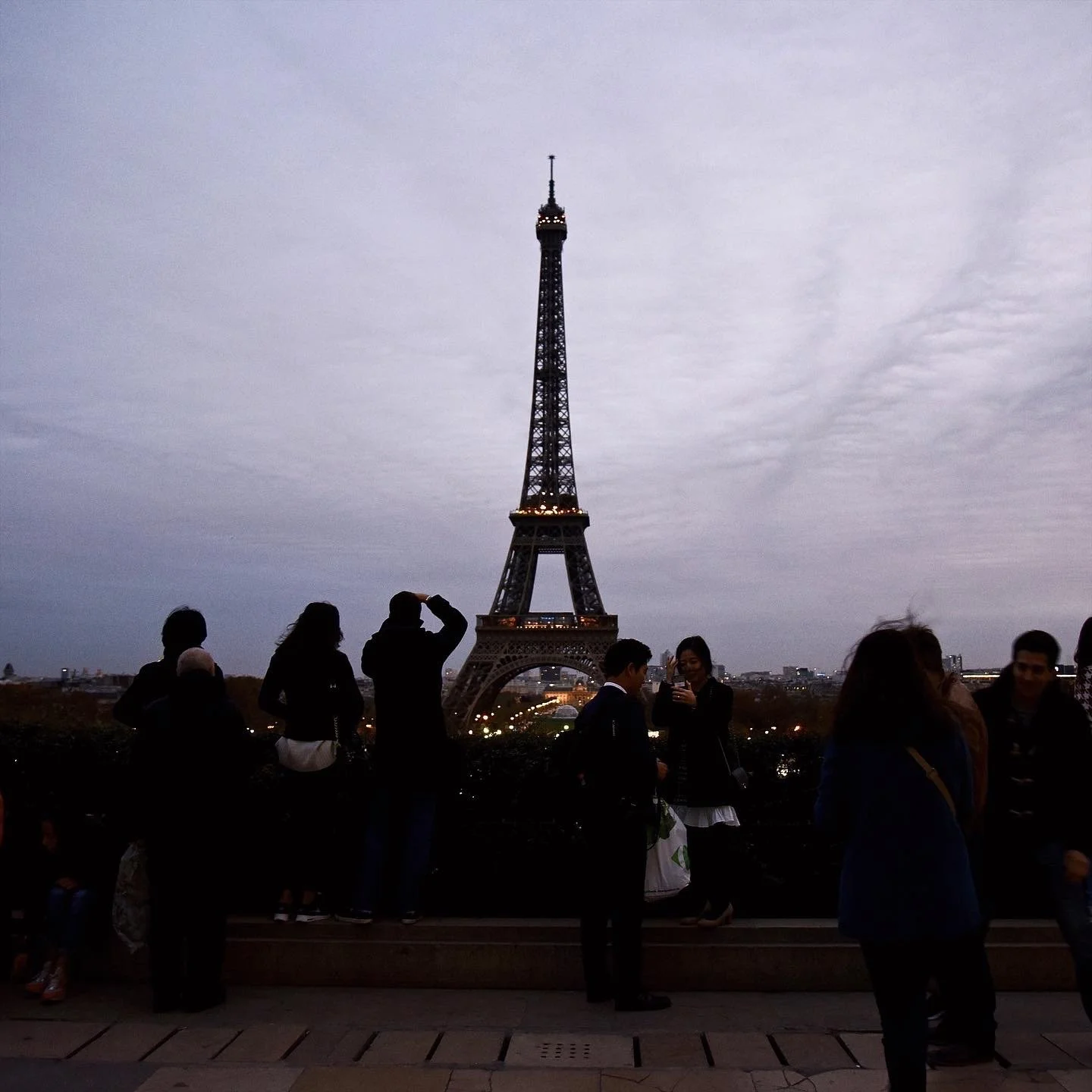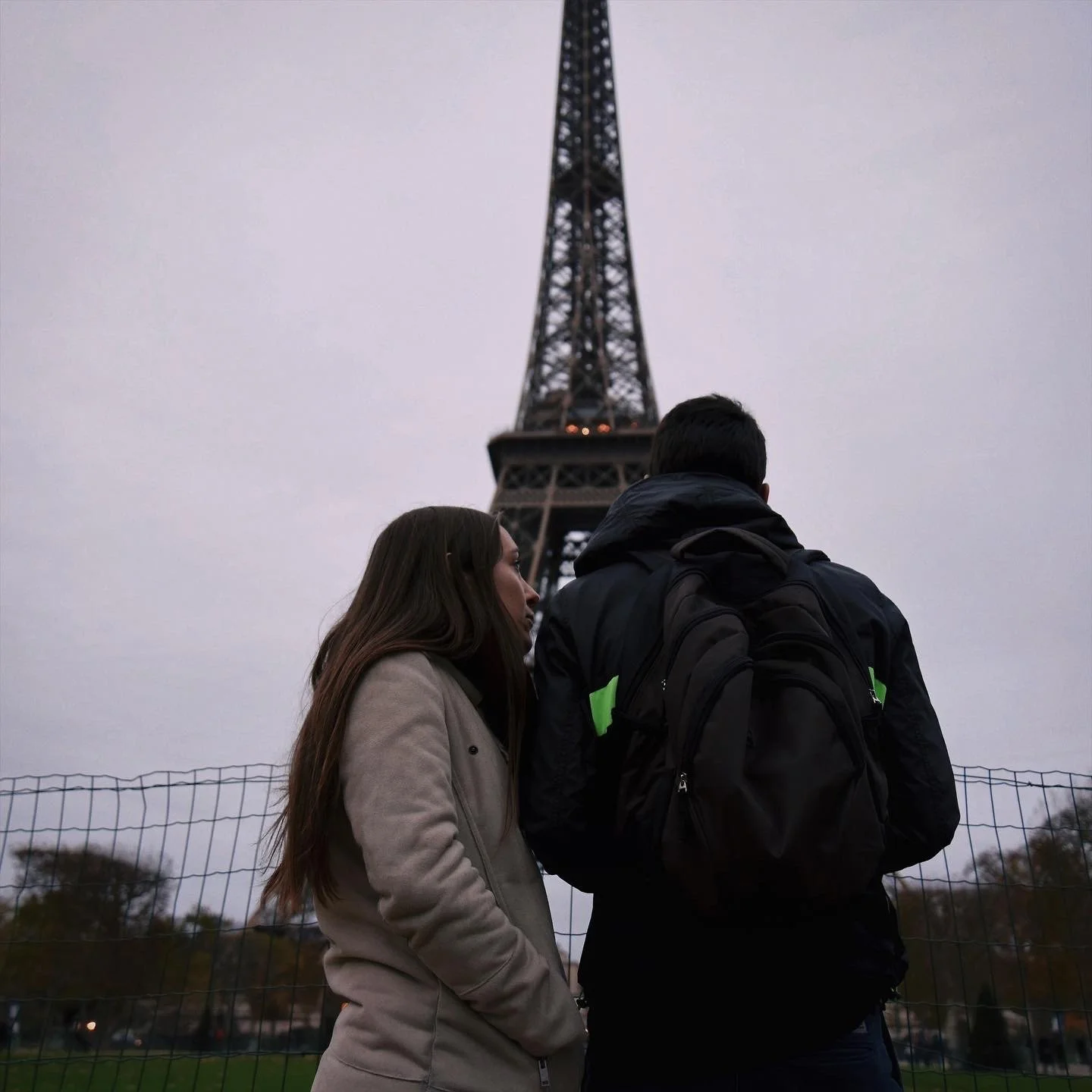 A Parisian couple somberly takes in the sight of the darkened Eiffel Tower.